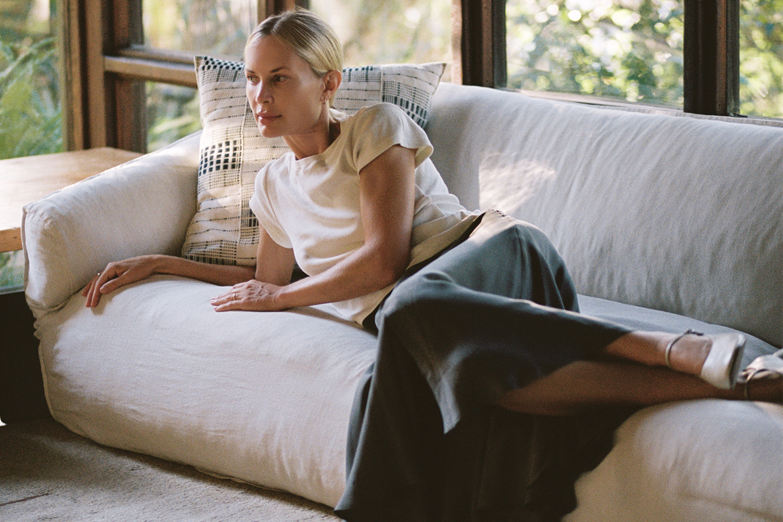 Raquel Martin wearing GALLERY TROUSERS in Organic Cotton Twill